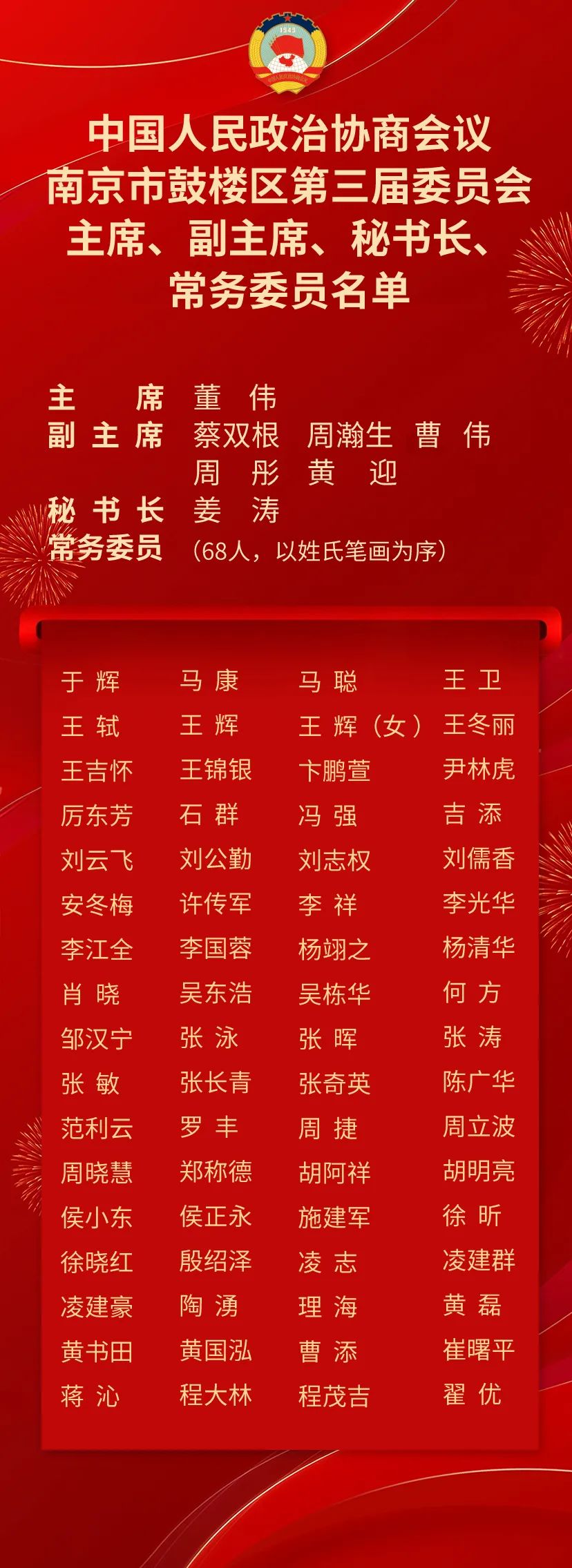 会议通过了大会《选举办法》、选举总监票人和监票人名单。经选举,董伟当选为政协南京市鼓楼区第三届委员会主席,蔡双根、周瀚生、曹伟、周彤、黄迎当选为政协南京市鼓楼区第三届委员会副主席,姜涛当选为政协南京市鼓楼区第三届委员会秘书长,于辉等68人当选为政协南京市鼓楼区第三届委员会常务委员。