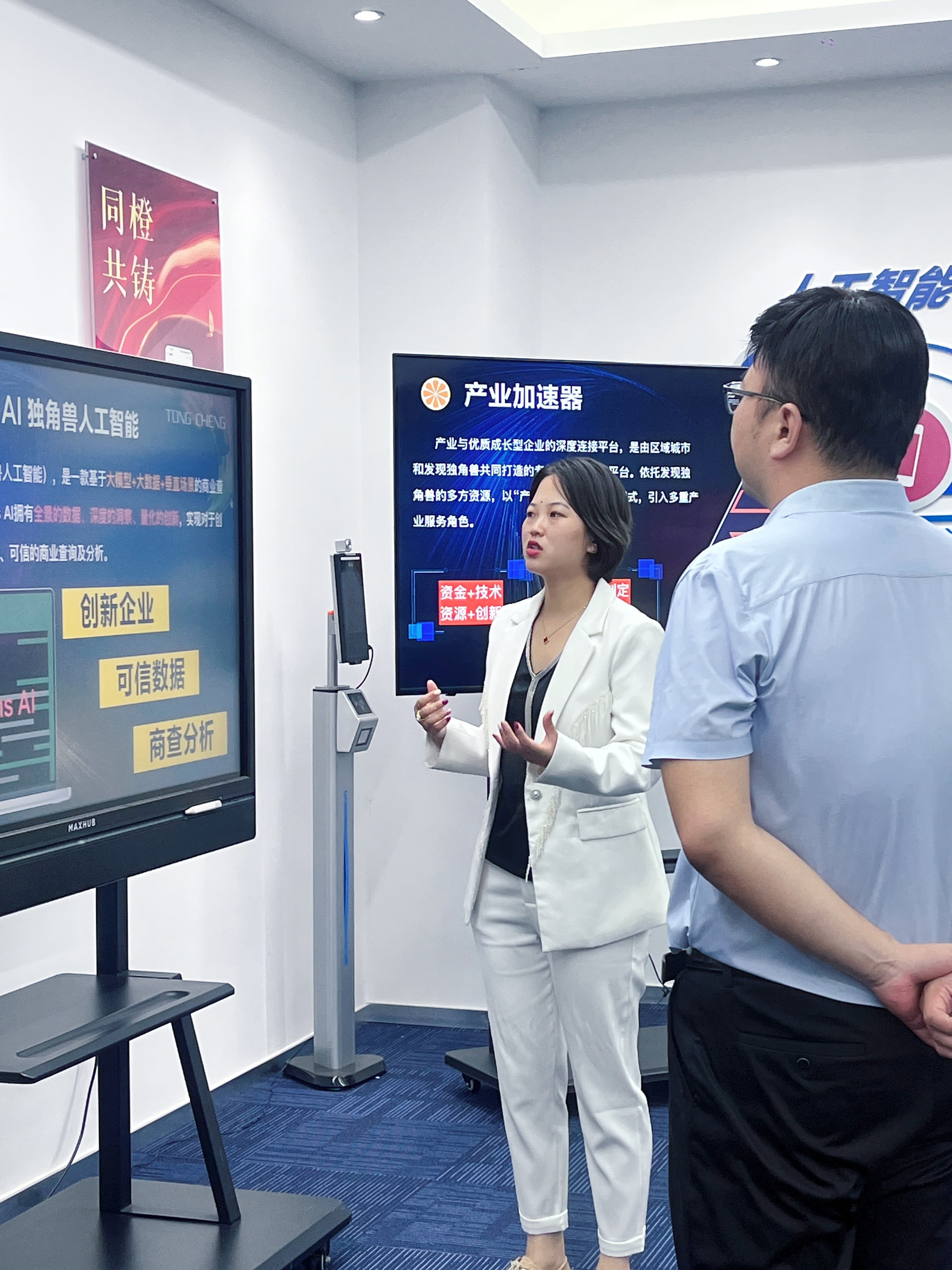 在开放生态展厅,同橙科创集团副总裁孙梦向镇江经济技术开发区招商局领导做了Unicorns AI(发现独角兽人工智能)发展情况的简介,发现独角兽是为全国提供数字化招商服务的平台,其中数十万家高企、瞪羚企业、专精特新企业以及培育独角兽企业能够更精准地以靶向地图的形式服务于镇江的招商引资。