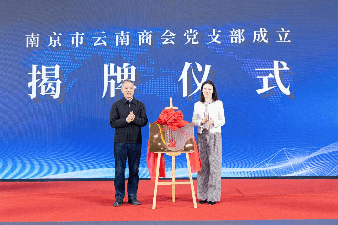 南京市工商联二级巡视员、市总商会党委书记郑德巍与南京市鼓楼区人民政府副区长金学春共同为南京市云南商会党支部成立揭牌。南京市云南商会将把党建工作融入商会运行和发展过程,以党建促会建,推动商会和谐、持续、健康高质量发展。